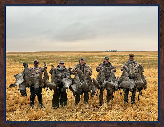 Our area is truly unique in the fact that we get all of the migratory game birds that have made the prairies a number one destination. We play host to 100s of thousands of snow, blue and Ross geese, bountiful numbers of white-fronted geese, and Canada geese of every size. Being in the pothole region affords us the opportunity to hunt locally raised ducks to migratory ducks in the longest season Saskatchewan has to offer. Mallards, pintail, wigeon, gadwall, blue and green-winged teal and shovelers make up the majority of our ducks. We have an added bonus bird that is a true prairie trophy, the Sandhill crane. Most hunters have never experienced the site and sound of decoying Sandhills like we offer here.
